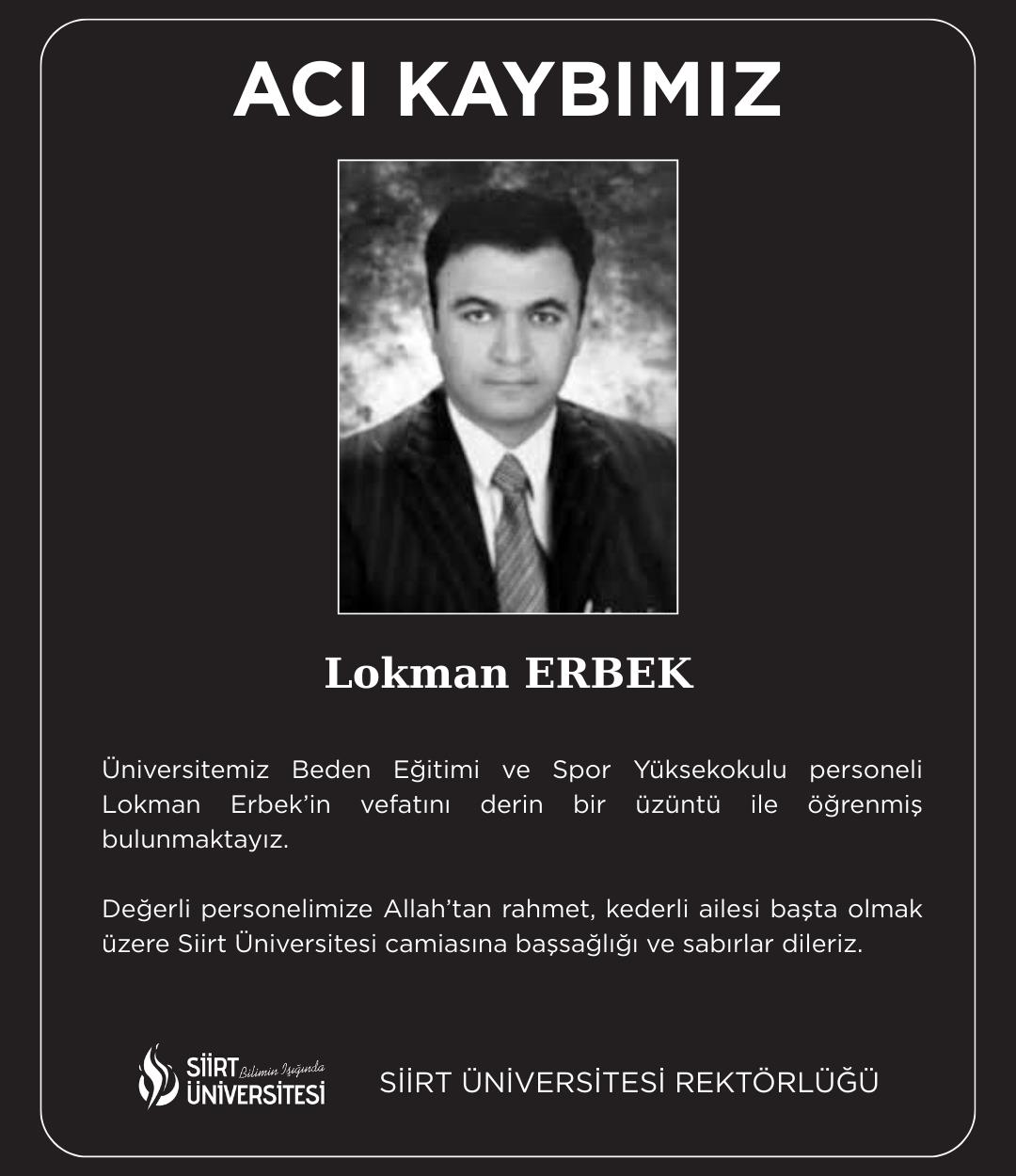 Üniversitemiz Beden Eğitimi ve Spor Yüksekokulu personeli Lokman Erbek vefat etmiştir. Kendisine Allah'tan rahmet, kederli ailesi başta olmak üzere Siirt Üniversitesi camiasına başsağlığı ve sabırlar dileriz.